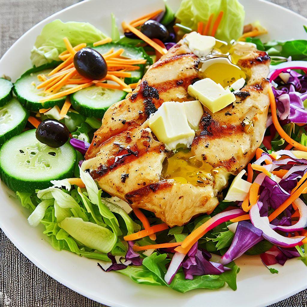 - Salad Symphony: While the chicken rests, toss the mixed greens, cucumber, red cabbage, carrot, scallions, black olives, and artichoke bottoms in a large bowl. Drizzle with lemon vinaigrette and toss until everything is singing in harmony.