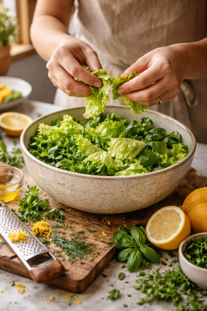 Drizzle just enough vinaigrette to lightly coat — start with half and toss gently with your hands. Yes, hands. They are gentler than tongs and far more intuitive.Taste a leaf. Add more dressing only if needed. Salad should be kissed, not drowned.