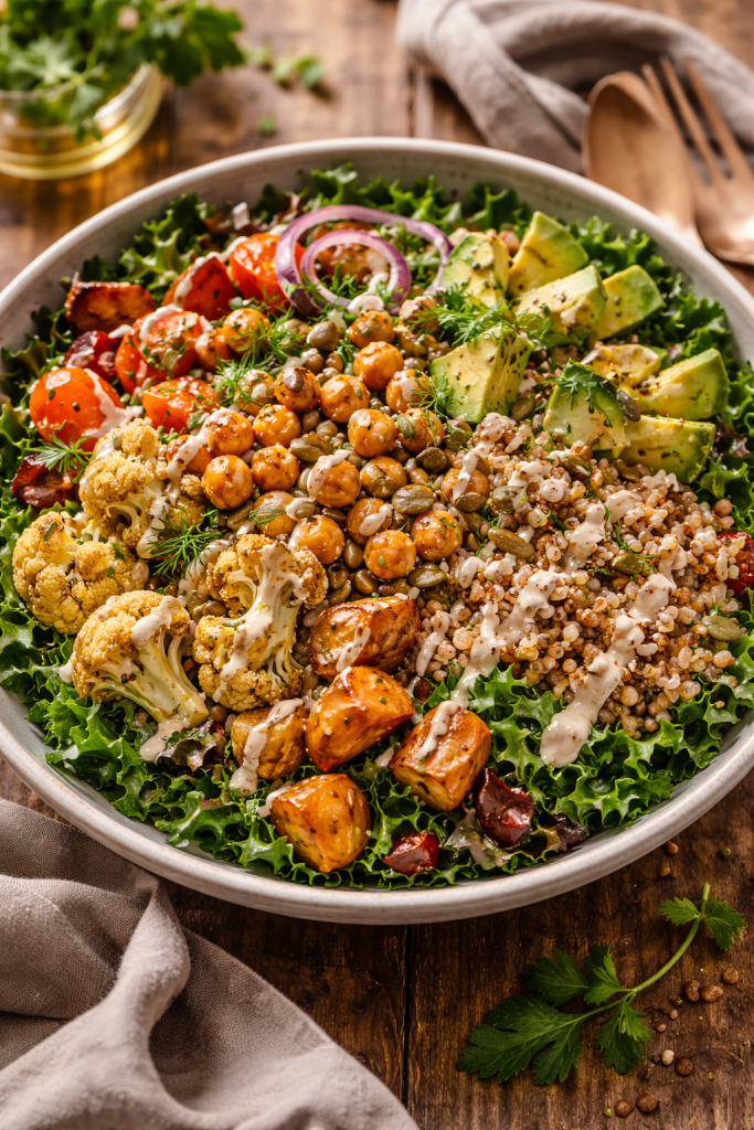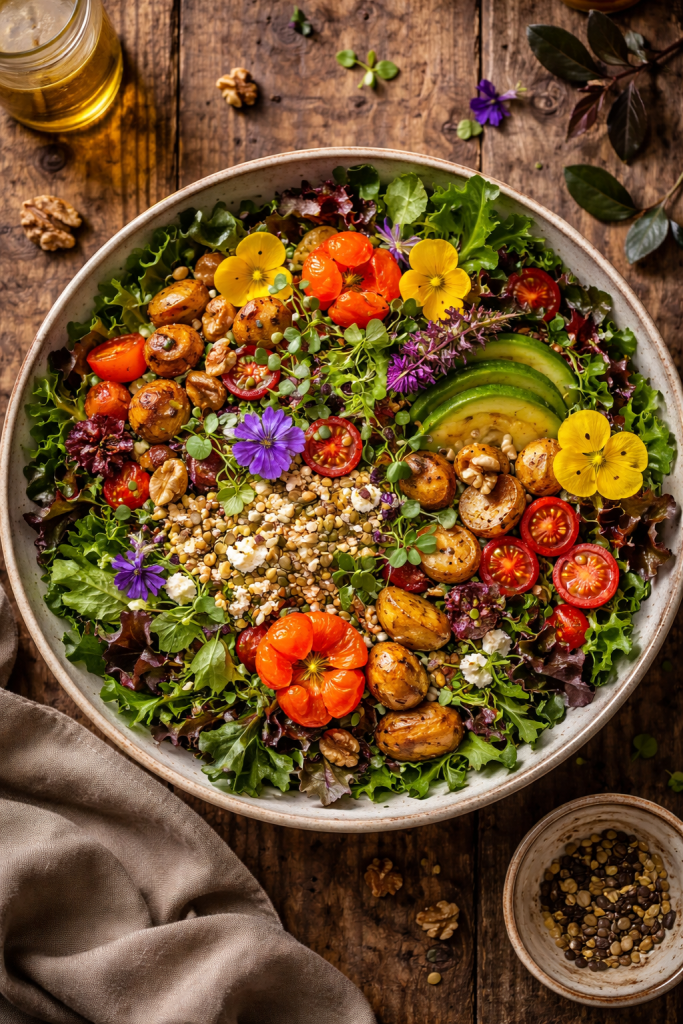 Here’s the thing about salad: leafy greens require significantly less land and water than animal proteins. Producing a pound of beef can require thousands of gallons of water, while many leafy greens grow in a fraction of that. Lentils and chickpeas, which I often toss into my salads, fix nitrogen in the soil as they grow—meaning they actually improve soil fertility rather than deplete it. When we build a salad around diverse plants—greens, herbs, grains, seeds—we’re not just feeding ourselves. We’re supporting biodiversity.