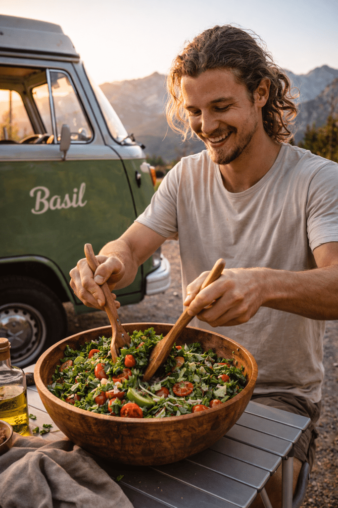 I was parked beside Basil—my green vintage VW van—at the edge of a trailhead after a long morning hike. I had a cooler packed with leftover roasted vegetables, a jar of homemade dressing, and a container of farro. I tossed everything together on a camp table with a handful of wild arugula growing nearby (foraged responsibly, just a few leaves). That bowl tasted like sunlight and sweat and gratitude. It felt earned.