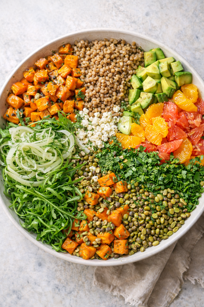Below is one of my favorite frameworks: a warm roasted vegetable and lentil salad with bitter greens, sharp vinaigrette, and toasted seeds. It’s modular. Adaptable. Built like good code.