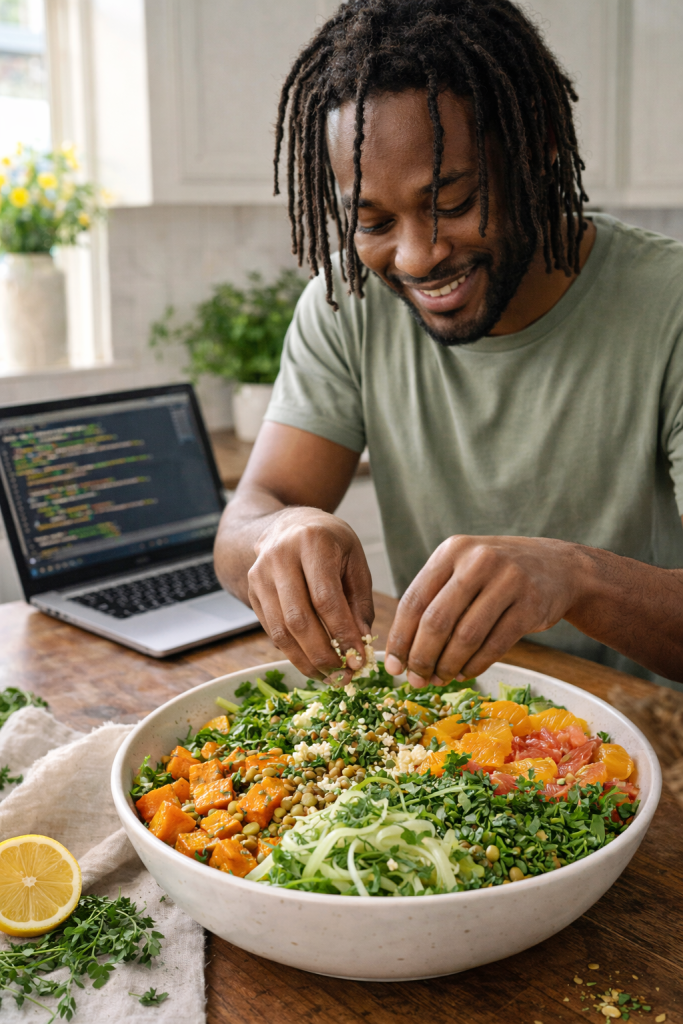 Body layer: proteins and complex carbohydrates. Lentils, grilled chicken, chickpeas, quinoa, roasted squash. This is your computational engine—macros that provide energy density and satiety.